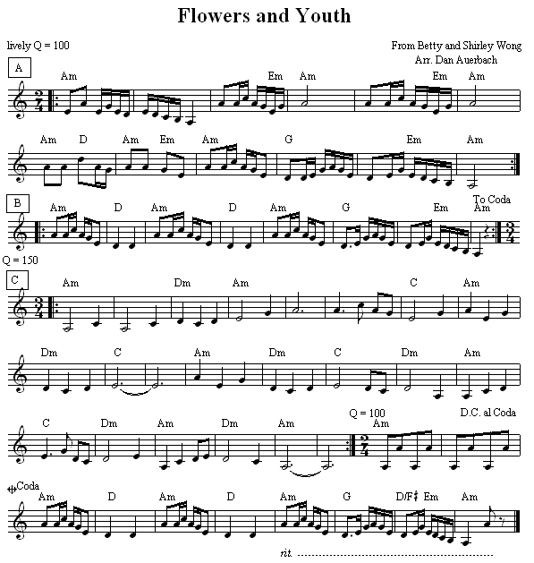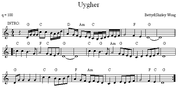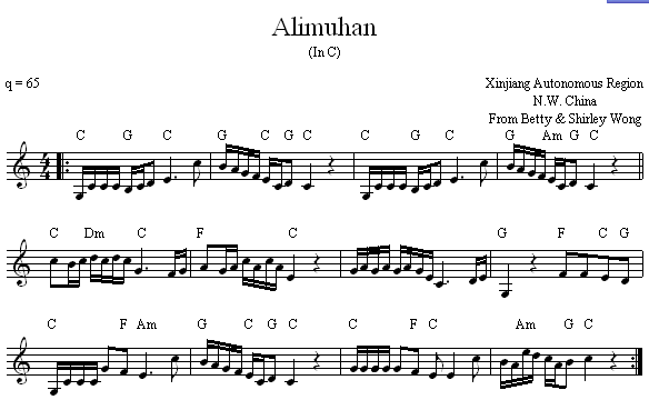 CHINESE MUSIC Alimuhan in C Notation 2008 Alimuhan in G Notation 2008 Uyghur Tune Notation 2008 Flowers And Youth Notation 2008 We welcome submissions of music notation for tunes and songs that are currently being taught at Lark Camp. PDF is our preferred format because it is most easily viewed and printed by most people. Please submit PDF files to Stuart Mason at stuartmasonmusic@gmail.com. Return to MUSIC LIBRARY or LARK CAMP HOMEPAGE. |