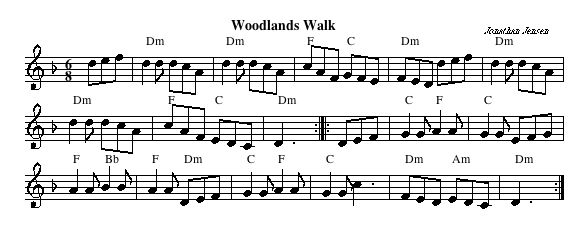 Longways Duple Minor 5-8 Twos 1/2 figure 8 up through the ones A2 1-4 Down a double and back 5-8 Ones 1/2 figure 8 down through the twos B1 1-8 Right hands across, Left hands across B2 1-2 1st corners change L shoulder (1st man, 2nd woman) 3-4 2nd corners change R shoulder (1st woman, 2nd man) 5-8 Partners 2-hand turn once round & end facing up. •The choreographers suggest a skip change step for the 1/2 figure 8s. Tune: "Woodlands Walk" by Jonathan Jensen, written for Gary Roodman's Choreography Class at Mendocino English Week 2005. Jonathan wrote the tune while walking in the redwood forest at Mendocino Woodlands State Park, on the way to the Big Tree. Dance: Written in the choreography class at English Week 2005 by Mary Devlin, Bob Fraley and Elizabeth Zekley Email Elizabeth Zekley at beth@larkcamp.com Original Dance Page